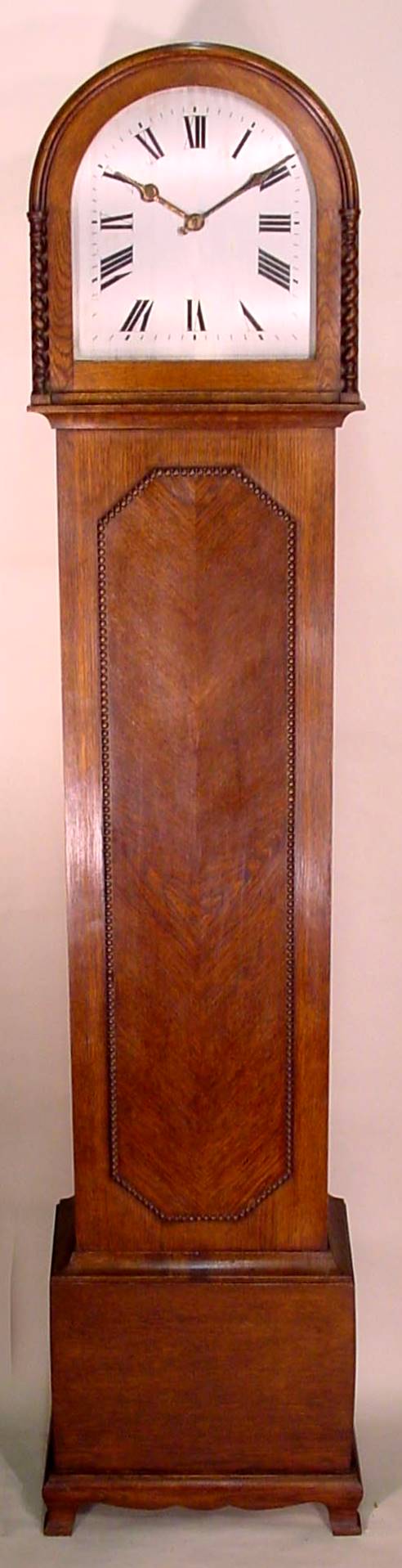 Standuhr elegante Art Dèco Standuhr in sehr guter Qualität, Eichengehäuse, spiegelbildlich angeordnete Furnierbilder auf der Gehäusetür, Westminsterschlag auf Tonstäbe, Plakette des Herstellers HAC , Hamburg-American-Clock Company auf der Innenseite der Tür, originales Pendel und Gewichte, Höhe ca..180 cm