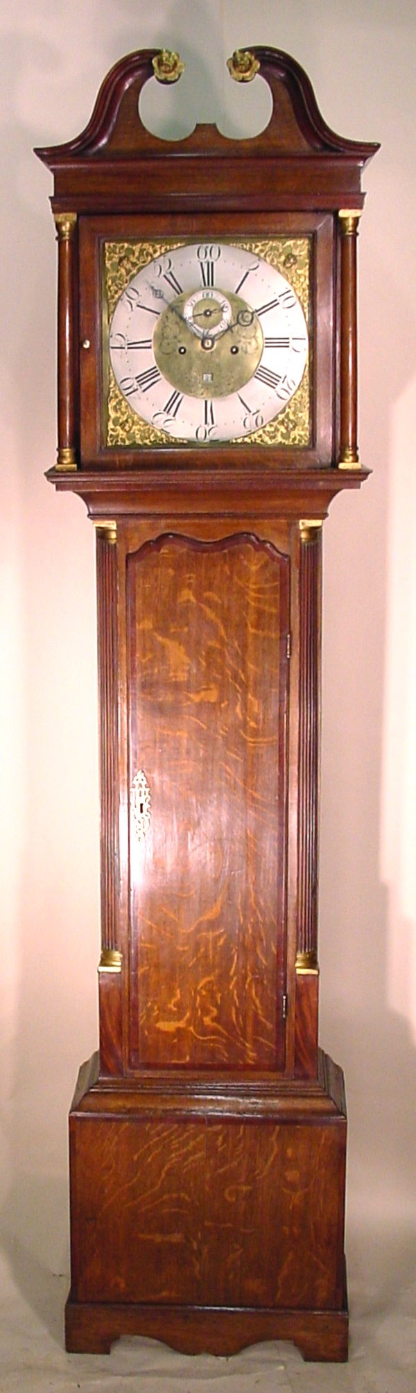 Standuhr gut proportionierte Eichenstanduhr mit Mahagoniverzierungen und Schwanenhalsgiebel, Kapitelle und Basen aus vergoldetem Holz, sehr dekoratives Messingzifferblatt mit versilberten Ziffernringen, 8-Tage-Werk mit Stundenschlag auf Glocke, Uhrmacher John Smith aus Chester, Höhe ca. 218 cm