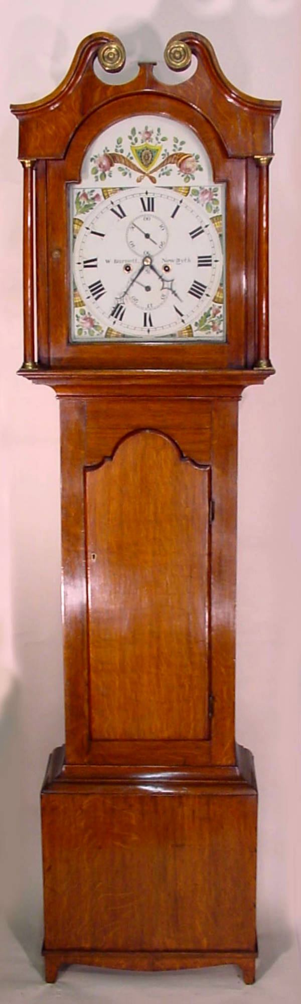 Standuhr zierliche, gut proportionierte Eichenstanduhr mit Schwanenhalsgiebel, sehr dekoratives Zifferblatt mit wunderschönen Blumenmotiven, 8-Tage-Werk mit Stundenschlag auf Glocke, Uhrmacher William Burnett aus New Byth (Schottland, Aberdeenshire), Höhe ca. 197 cm
