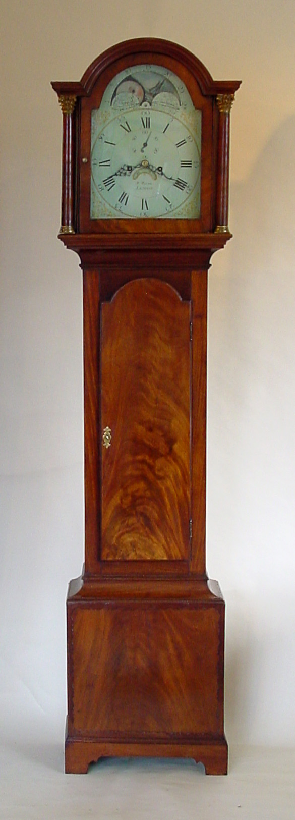 Standuhr mit Mondphase Mahagonistanduhr im klassischen Stil mit sehr schönen Furnierbildern, frühes gemaltes Zifferblatt mit einer sehr dekorativen Mondphasenanzeige im Bogenfeld, 8-Tage-Werk mit Stundenschlag auf Glocke, Uhrmacher John Payne aus Lenham, Höhe ca..202 cm